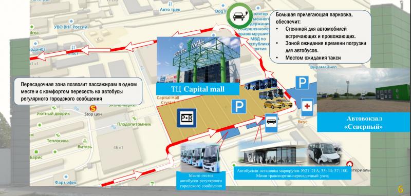 Минтранс обещает создать «мини транспортно-пересадочный узел». На схеме в презентации показана автобусная остановка для нескольких городских маршрутов, которая обеспечивает доступность лишь для ограниченной части города.