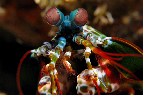 Ещё одна особенность — сложная система зрения. У рака-богомола роскошного три отдельных участка в каждом глазе отвечают за восприятие цвета, формы и движения. Он видит двенадцать основных цветов, включая ультрафиолет, и способен отслеживать поляризацию света — то, что большинству животных и не снилось.