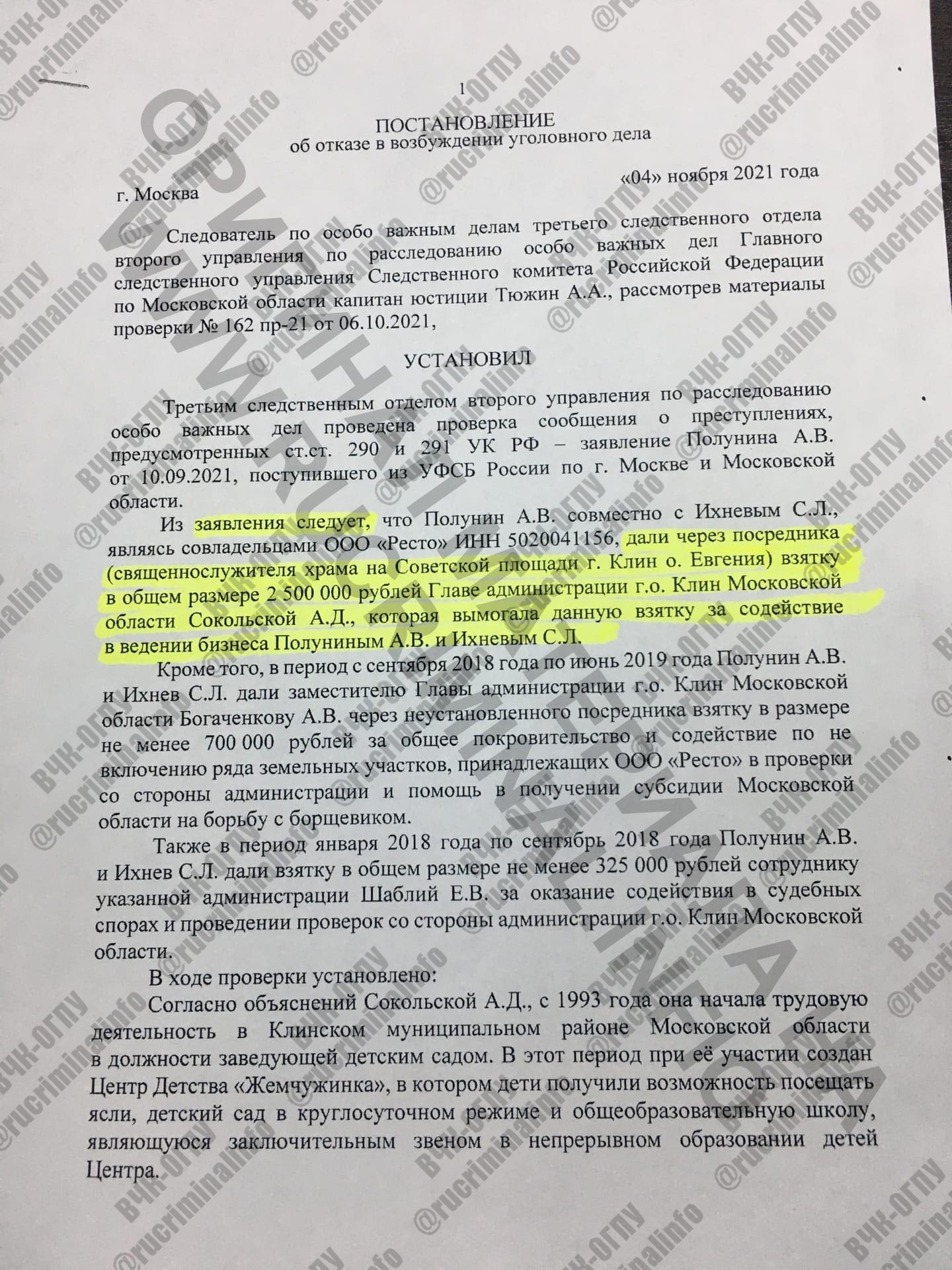 Предприниматель из Клина обратился с заявлением в следственные органы, в котором утверждает, что Алена Сокольская требовала взятки с коммерсантов. Для конспирации передавать их надо было протоиерею Русской православной церкви Евгению Малькову. Тот в свою очередь передавал их Алене Сокольской. Предприниматель рассказал о том, что он таким образом передал отцу Евгению 2,5 млн. рублей.