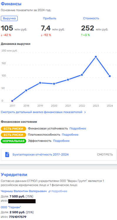 Итак, ООО «Верен Групп», учрежденное в 2017 году, по итогам 2024 года демонстрировало выручку на 105 млн рублей и ни о каких миллиардах рублей речи не идет.