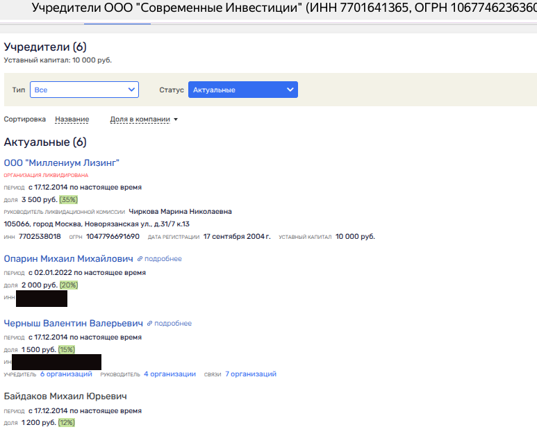 Кроме этого, на то, что г-н Черныш не просто наемный персонал в истории банка Якунина, нам намекает и его доля в ООО «Современные Инвестиции», где его партнером был все тот же вездесущий Михаил Байдаков.