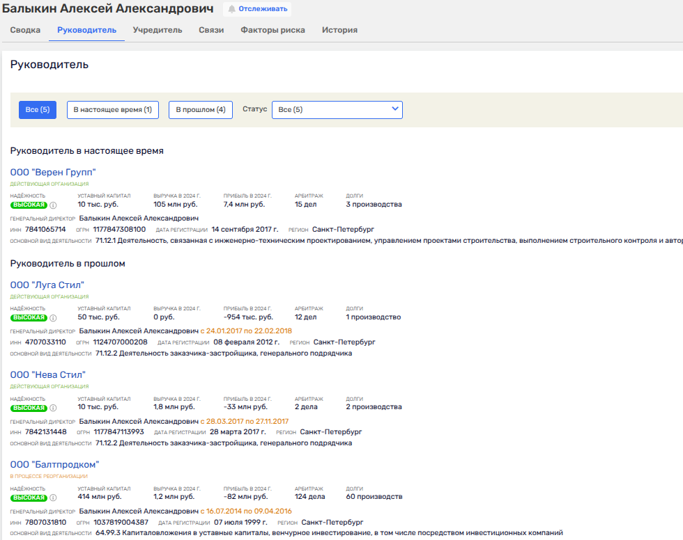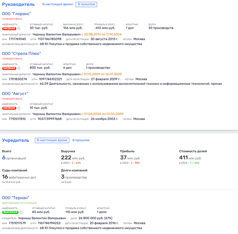 Так, с 30.08.2013 по 17.10.2024 года Валентин Черныш был директором ООО «Глоракс», которое было ликвидировано, а правопреемником стало одноименное АО и некое ООО «Автор», подконтрольное Дмитрию Коновалову - бывшему партнеру Биржина по Глораксу.