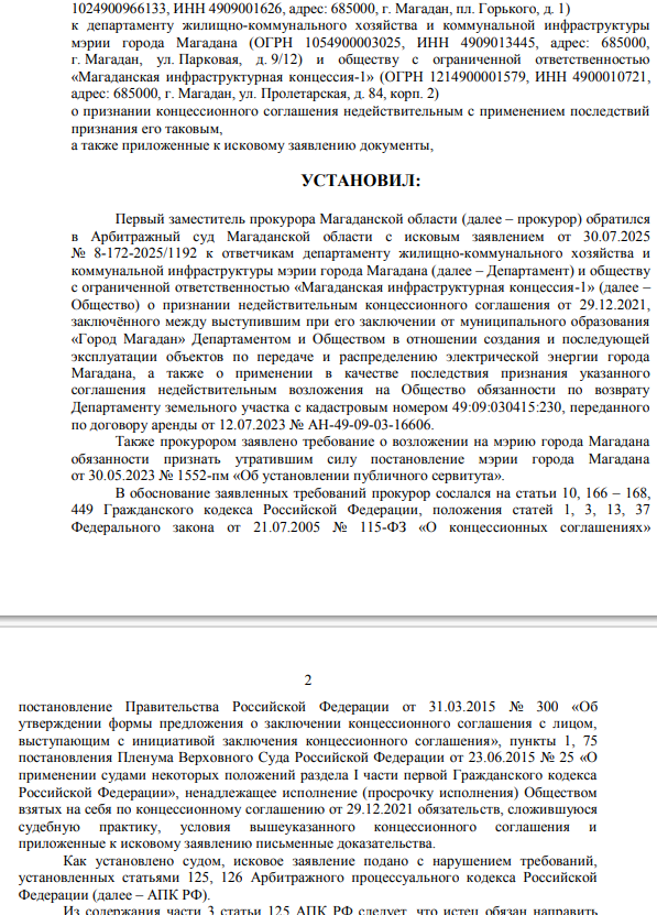 Прокурор потребовал признать недействительным концессию от 29 декабря 2021 года по созданию и последующей эксплуатации объектов по передаче и распределению электроэнергии Магадана и вернуть на баланс департамента участок площадью 11111 кв. м, который ООО-шка получила по договору аренды в 2023 году. Причиной столь резких претензий надзорного органа стало ненадлежащее исполнение (просрочка исполнения) ООО взятых на себя по концессионному соглашению обязательств.