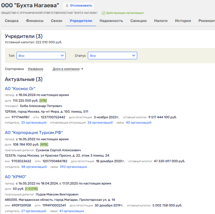 В числе тех, кому КРМО открыла доступ к бюджетной кормушке, не только Чайка, но и другие не менее известные лица. Вот, например, по ООО «Бухта Нагаева», где у Корпорации крошечная долька, в числе таковых оказался олигарх Владимир Евтушенков - через АО «КОСМОС ОГ» (сеть отелей Cosmos Hotel Group). В том же ООО отметилась не менее скандальная госкорпорация - АО «Корпорация Туризм.РФ», что уже не раз упоминалась в громких историях с освоением бюджета.