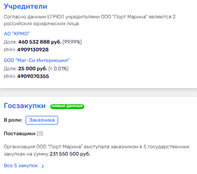 Помимо этого, Миняйло - директор ещё двух активов КРМО: ООО «Порт Марина» и ООО «Морской логистический центр», через которые прогнали более 12 млрд рублей в виде госконтрактов на услуги по сопровождению концессионного соглашения в отношении создания и последующей эксплуатации Морского логистического центра «Магадан».