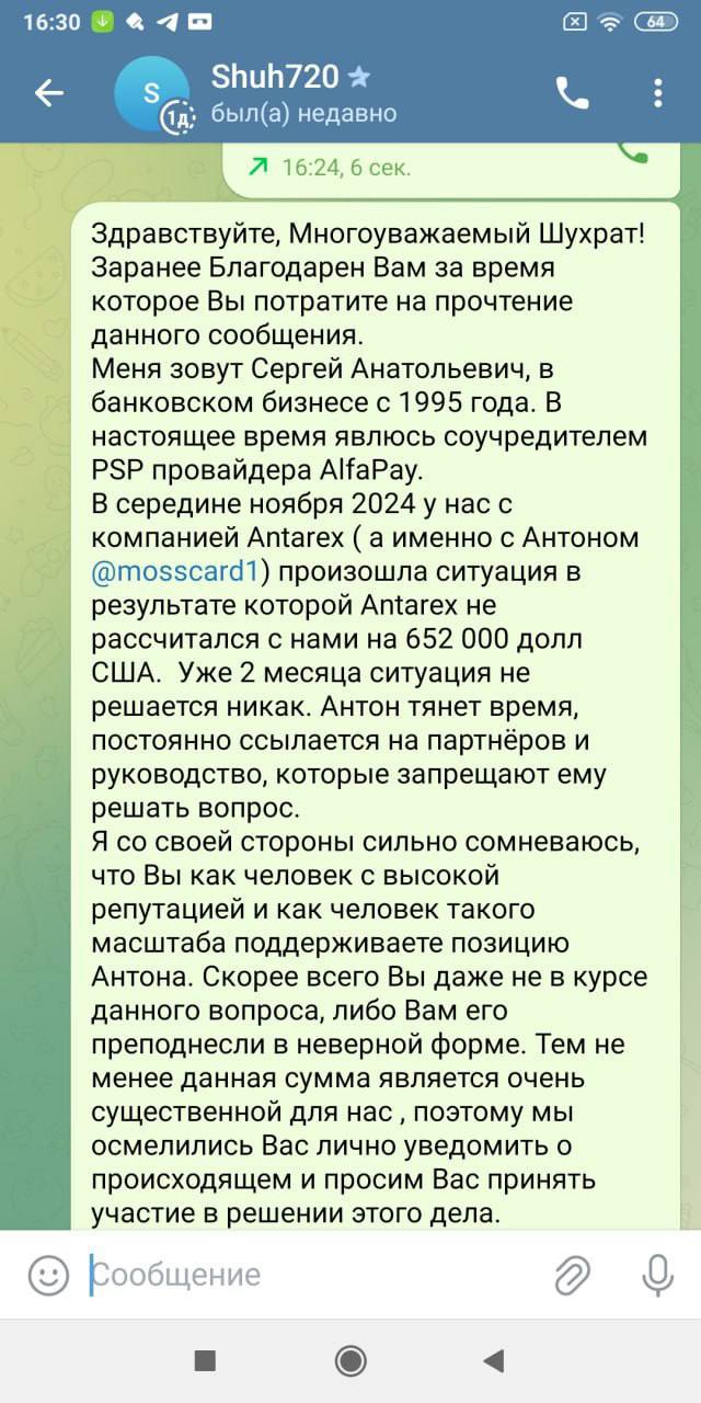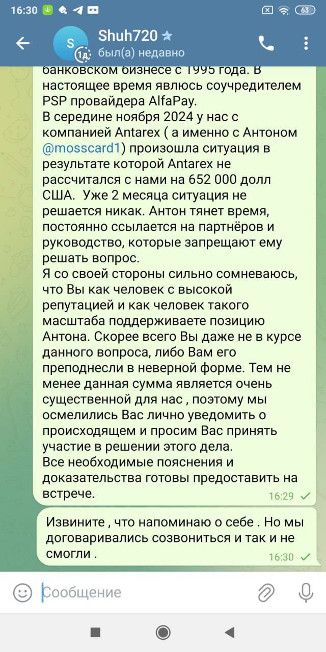 Когда давление усиливается и угроза не работает, включается более серьезный игрок — Юрий Квашонкин, номинальный бенефициар АВСех, реальный — Шухрат Расулов. Юрий не ограничивается угрозами — он приказывает Москаленко выдать $6 000 пострадавшему.