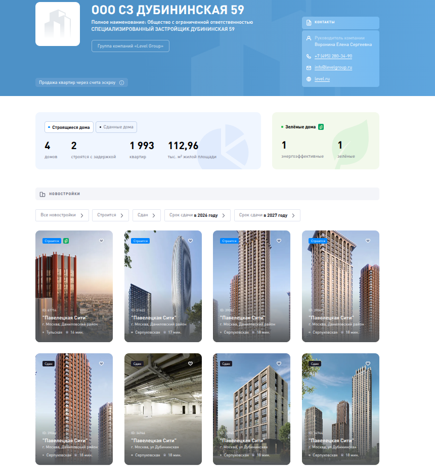27 октября 2025 года из ООО СЗ «Дубининская 59», которое строит жилой квартал в Москве - «Павелецкая Сити», вышел один из совладельцев, оставив все 100% доли ООО «Левел Груп», связанной с олигархом Мошковичем.