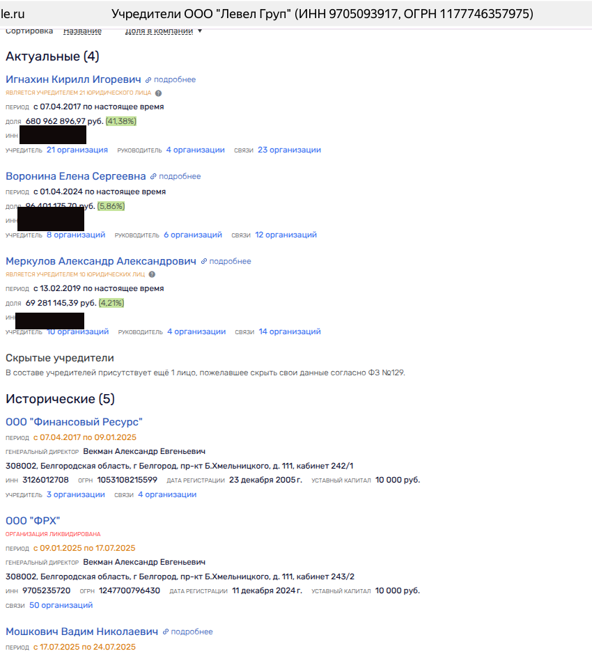 В ООО «Левел Груп» долю имеют всё та же директор СЗ «Дубининская 59» Воронина, директор всего дивизиона Игнахин и Александр Меркулов - директор по девелопменту Level Group. С 24 июля 2025 года Мошковича в числе владельцев скрывают. Таким образом, он, став токсичным, попытался дистанцироваться от активов, но в то же время снимает сливки с проектов и вовсе не вышел из них.