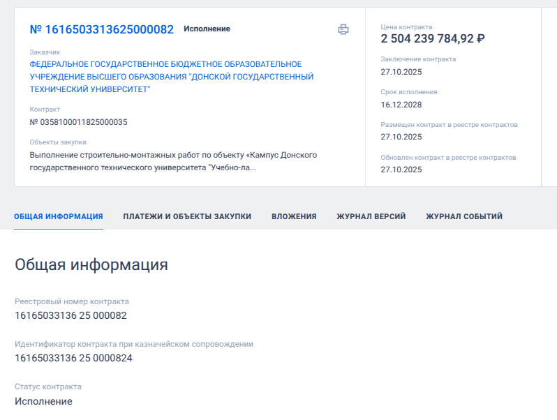 Донской государственный технический университет 27 октября подписал контракт на первый этап строительства в кампусе университета учебно-лабораторного корпуса № 1. Стоимость контракта - 2,504 млрд рублей, из которых аванс 49% - 1,22 млрд рублей.