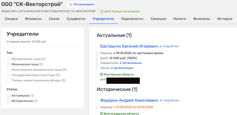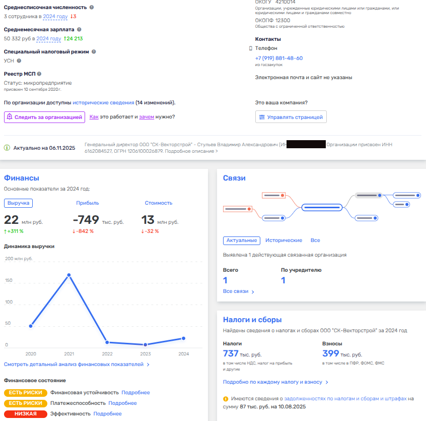 Исполнителем назначили ООО «СК-Векторстрой», которое было учреждено в 2020 году, но при этом в штате фирмы всего три сотрудника. Да и сама она оставляет желать лучшего - убытки в 2024 году составляли 749 тыс. рублей, а на август 2025 года долг по налогам был 87 тыс. рублей.