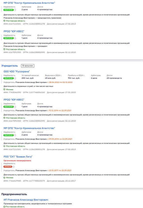 Ранее Стульев был соучредителем некоего юрлица - РРОО «ЮР КФЕС», которое прописано по одному адресу с неким МР ОПО «Контр-Криминальное Агентство». Оба этих юрлица связаны с владельцем ряда ЧОПов Александром Ровчаковым.
