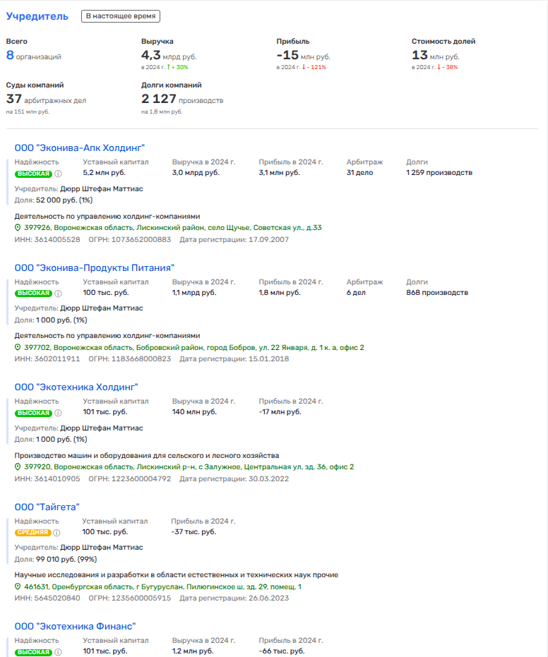 Говорить, что Дюрр перестал вести дела с Германией и офшорами было бы довольно глупо. Компания Ekosem-Agrar AG с пропиской в Германии никуда не делась, а все эти рокировки под российскую юрисдикцию не более чем, на наш взгляд, попытка обойти ограничения.