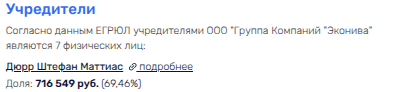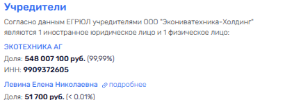 Например, некое немецкое юрлицо - ЭКОТЕХНИКА АГ - вместе с директором ряда фирм группы Еленой Левиной (партнером Дюрра) сообща владеют по сей день «Экониватехника-Холдинг», а у того в активе доли в 5 дочерних фирмах. То есть капиталец уходит частично в не дружественную РФ Германию - через совладельца. Кто стоит в конце цепочки Экотехники АГ, остается только догадываться.