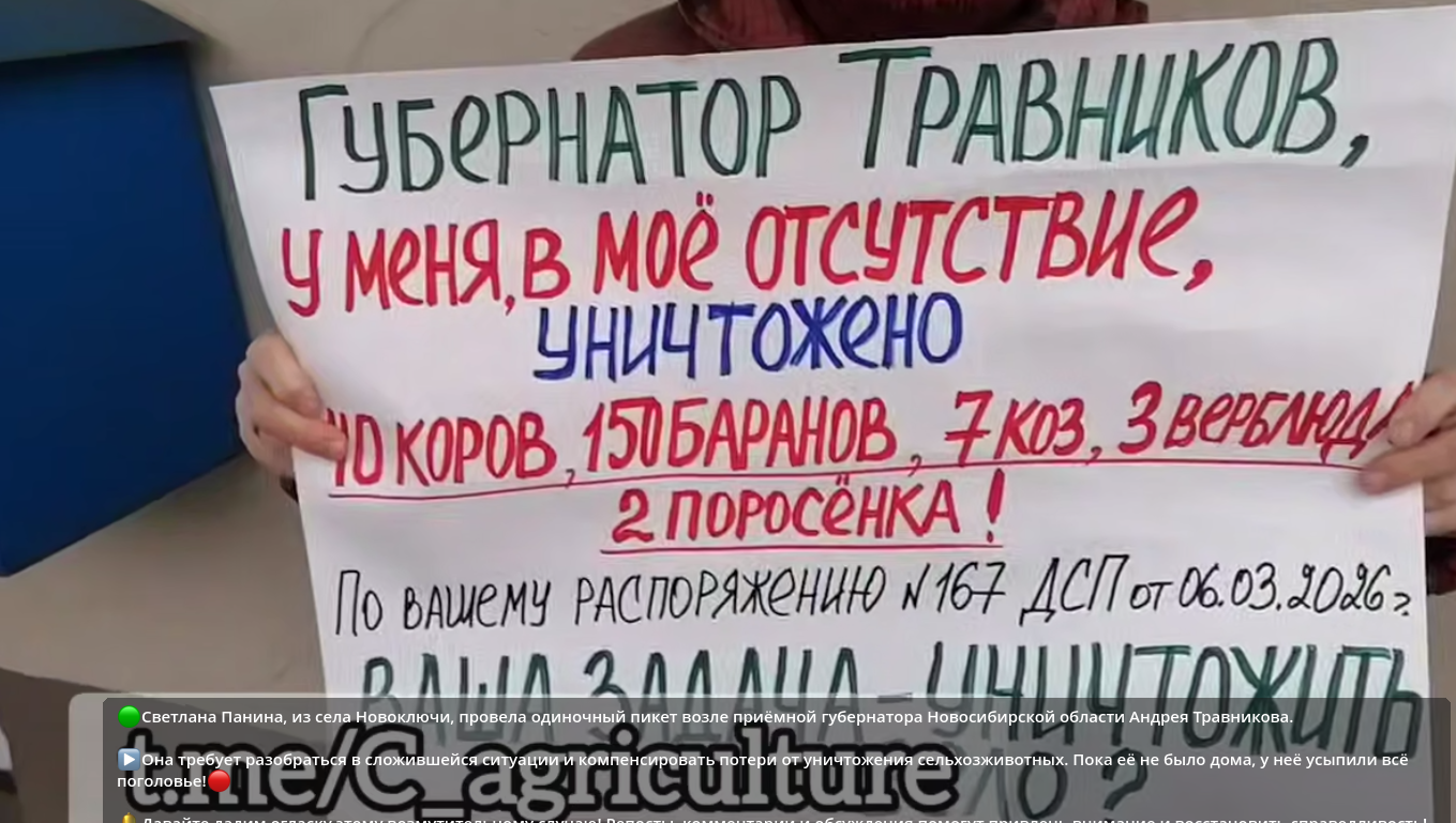 Уже 10 марта Следком России начал проверку возможных нарушений со стороны чиновников новосибирского Минсельхоза после массовых жалоб жителей села Козиха, где идет принудительное изъятие скота. Среди пострадавших в этом селе - семья, воспитывающая ребёнка с ДЦП, для которой скот — единственный заработок. Но когда губернатора волновали такие мелочи, да?