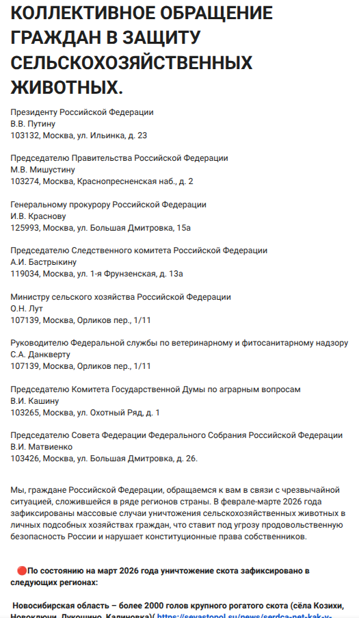Суть претензий фермеров подсвечена в обращении к федеральным властям, под которым идет сбор подписей. В нём отмечается, что на март 2026 года уничтожено уже под 6 тыс. голов скота по нескольким регионам и, похоже, это не предел.
