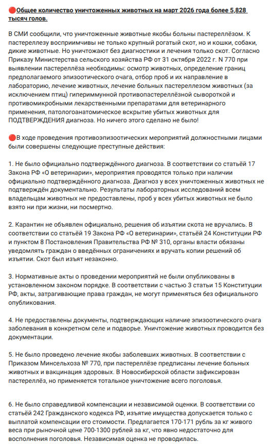 Юристы и эксперты в один голос говорят, что ветеринарные регламенты не предусматривают полного забоя поголовья при пастереллезе — инфекцию успешно лечат антибиотиками, а здоровых особей прививают. А еще никто не может изъять животных без оформления документов, в противном случае - это нарушение законодательства и превышение полномочий!