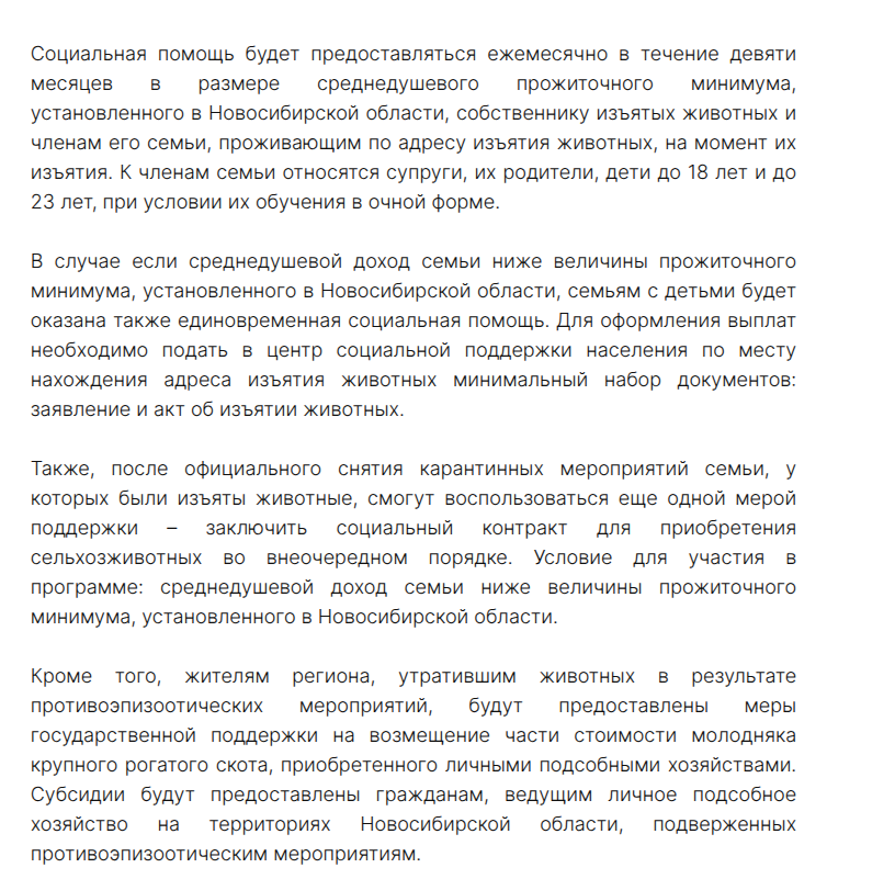 Команда Травникова ограничивается обещалками о выплате компенсаций, но никаких сумм и сроков не оговаривается. А еще с барского плеча новосибирские власти предлагают социальный контракт для приобретения сельхозживотных во внеочередном порядке, то есть для выплат - пройдите семь кругов ада с пачками доказательных документов, а потом идите и покупайте без очереди новый скот. На какие шиши при оговоренных выше 170 р за кило живого веса, когда на корову нужно в 5 и более раз больше?