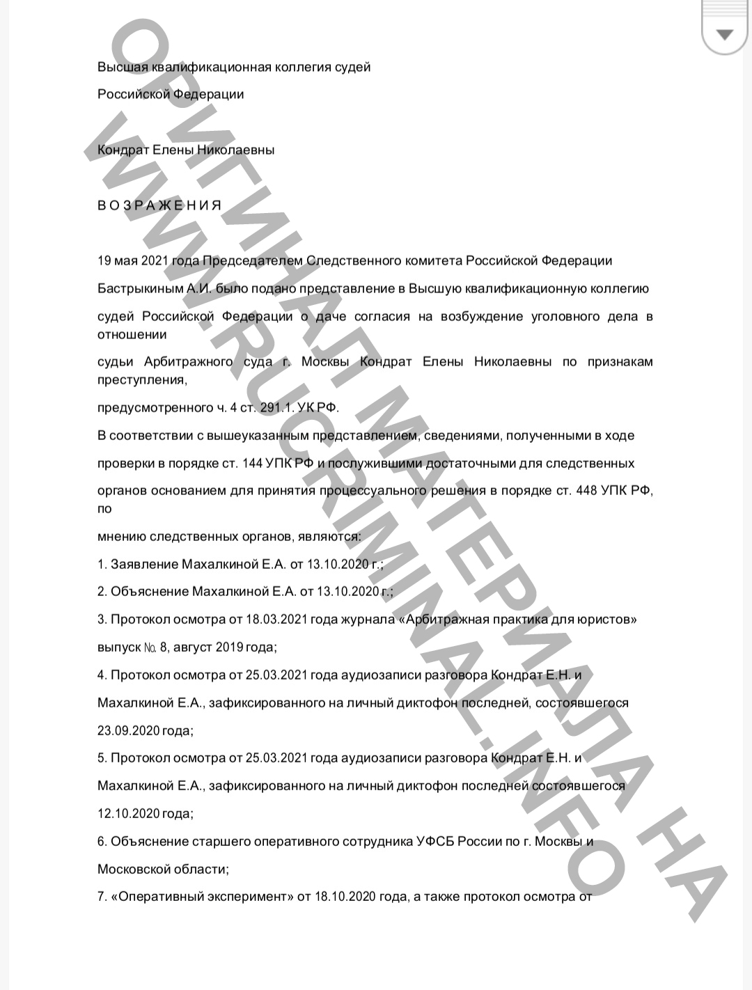 Сама Кондрат настаивает, что передавала деньги бывшей помощнице Махалкиной по её же просьбе, поскольку ей не хватало для покупки квартиры и стала жертвой провокации. При этом Кондрат привела запись своего разговора с Махалкиной, в которой та признется, что в 2020 года быдла задержана ФСБ при получении денег от управляющей Голошумовой А.В.. В личной беседе с Кондрат Е.Н. 27.04.2021г. (записи разговора имеется), Махалкина Е.А. сообщила, что её взяли с поличным, есть её отпечатки пальцев и в течение 10 лет она должна сотрудничать.