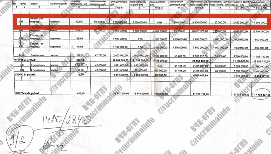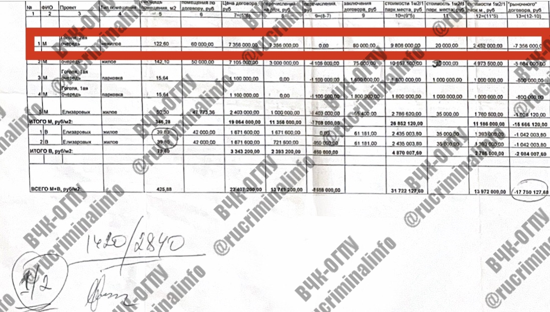 В нашем распоряжении оказались документы из чёрной бухгалтерии Муравьева, в которых он подробно фиксировал все движения денег от него к генералу и не только. Вкратце напомним, что генерал Митрофанов, помимо традиционной деятельности свойственной «оборотням в погонах», ещё наладил незамысловатый бизнес – покупал у предпринимателя Андрея Кривошеина с большими скидками люксовые автомобили и перепродавал их другим предпринимателям по рыночной цене, что в последствии было отражено в уголовном деле. Покупал Игорь Митрофанов и объекты недвижимости в строящихся жилых комплексах с участием Андрея Муравьева, и так же перепродавал их. А чтобы гигантскую скидку не было видно, Муравьев сначала передавал генералу наличные деньги, которые члены его семьи, выступавшие по официальным документам покупателями, перечисляли уже на счёт застройщика под видом своих денег. Как видно из оказавшихся в распоряжении редакции материалов, общая «скидка», а точнее взятка, переданная Андреем Муравьевым генералу Митрофанову и его заместителю Алексею Ветрову составила почти 18 млн рублей, и это только по двум жилым комплексам. Причём одно из коммерческих помещений Митрофанов перепродал Андрею Кривошеину.