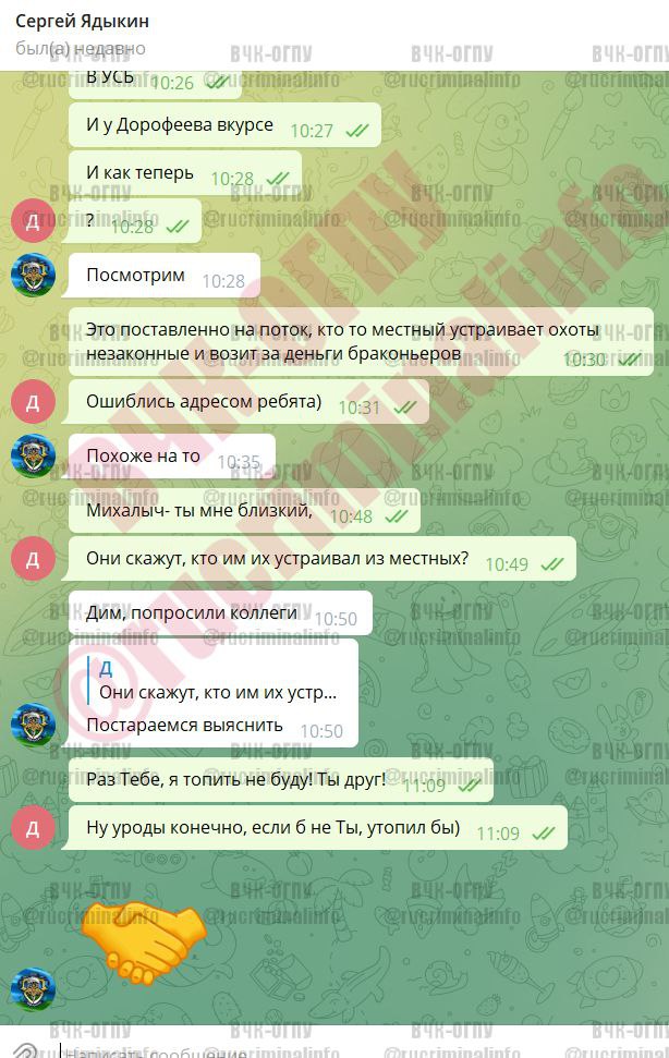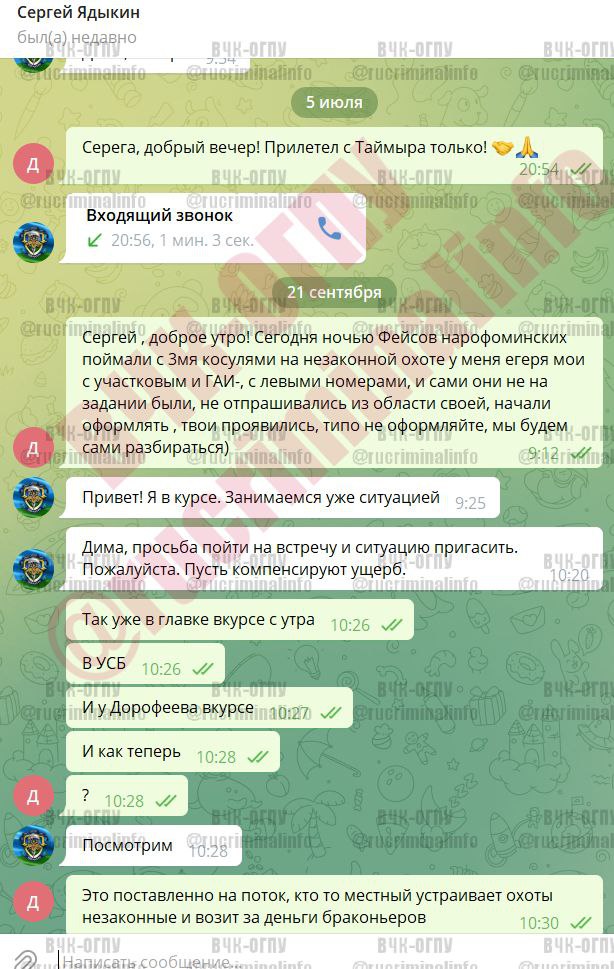 В распоряжении ВЧК ОГПУ попала переписка между Дмитрием Клюевым из Кворума и начальником УФСБ по Калужской области полковником Сергеем Ядыкиным касательно ситуации с незаконной охотой и замешанными сотрудниками правоохранительных органов. Дмитрий Клюев говорит Ядыкину, что о ситуации в курсе Дорофеев – начальник УФСБ по Москве и Московской области и УСБ ФСБ (откуда интересно гражданское лицо в курсе таких подробностей в принципе).