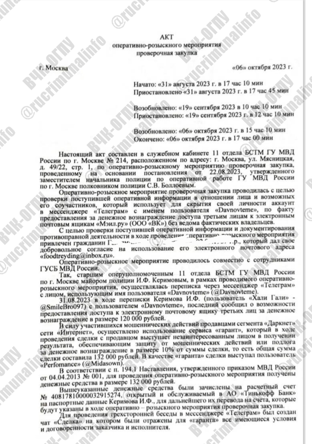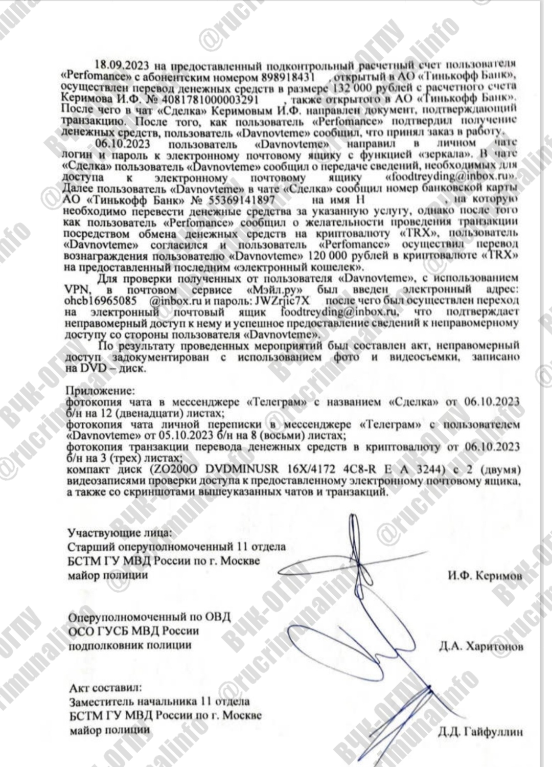 05.10.2023 г. Керимову от «davnovteme» пришёл логин и пароль от почты [email protected], которую предоставил «друг» Керимова – некий Г.Э.Э., давший добровольное согласие на участие в проверочной закупке (ПЗ) и подтвердивший, что почта принадлежит ему. Логин и пароль были от дублирующего ящика [email protected].