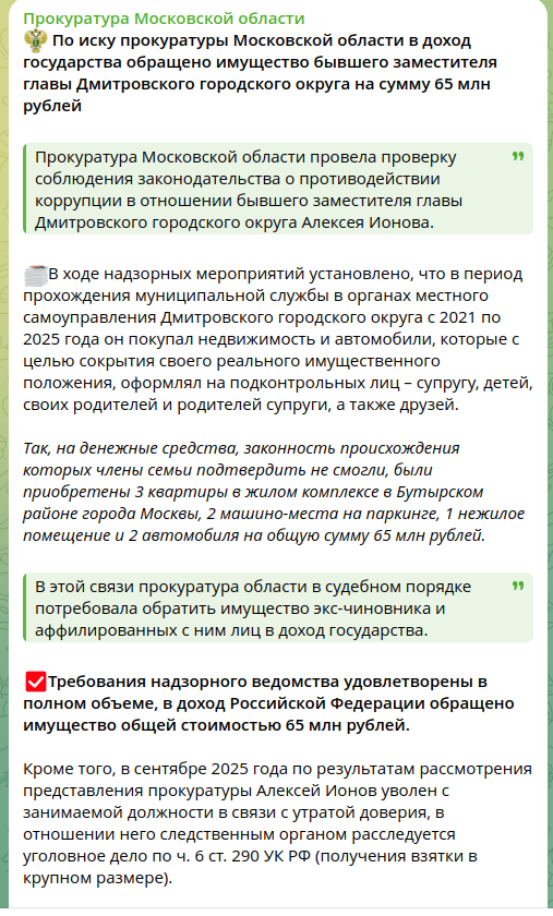 Буквально месяц назад у Ионова, спешно уволенного с поста еще осенью 2025 года, изъяли имущества на 65 млн рублей. Три квартиры в Москве, два места на паркинге и пара автомобилей, офис, стоимость которых превышала его официальные доходы, в 2021-2025 годы скупались и оформлялись на родню и друзей.
