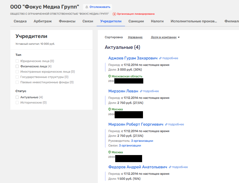 При этом «Омис'92» владело некое ООО «Фокус Медиа Групп», где уже с 2014 года присутствовали братья Мирзояны - Левон (скандально известный по банкротству БТА-банка и «М2М Прайвет банка») и Роберт. Там же мы видим и видного деятеля спортивной сферы - Гурама Аджоева, что был вице-президентом Ночной хоккейной лиги, в которую входили видные политики и бизнесмены. Возможно, именно Аджоев позднее познакомил Мирзоянов с сенатором Керимовым.