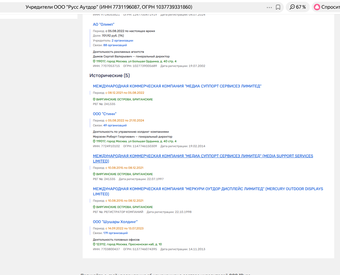 И что интересно: вплоть до 2023 года в числе владельцев ООО «Русс Аутдор» фигурировали матерые офшоры с Британских Виргинских островов - MEDIA SUPPORT SERVICES LIMITED и MERCURY OUTDOOR DISPLAYS LIMITED, чьи бенефициары не раскрывались. А сенатор ли Керимов был тем бенефициаром, ведь именно его капиталы были задействованы при скупке рекламных активов?