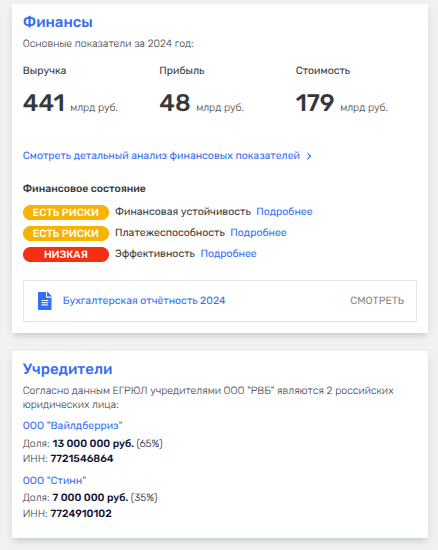Именно на «РВБ», судя по всему, и выведены основные капиталы дивизиона: в 2024 году выручка фирма была на уровне 441 млрд рублей при чистой прибыли - 48 млрд рублей.