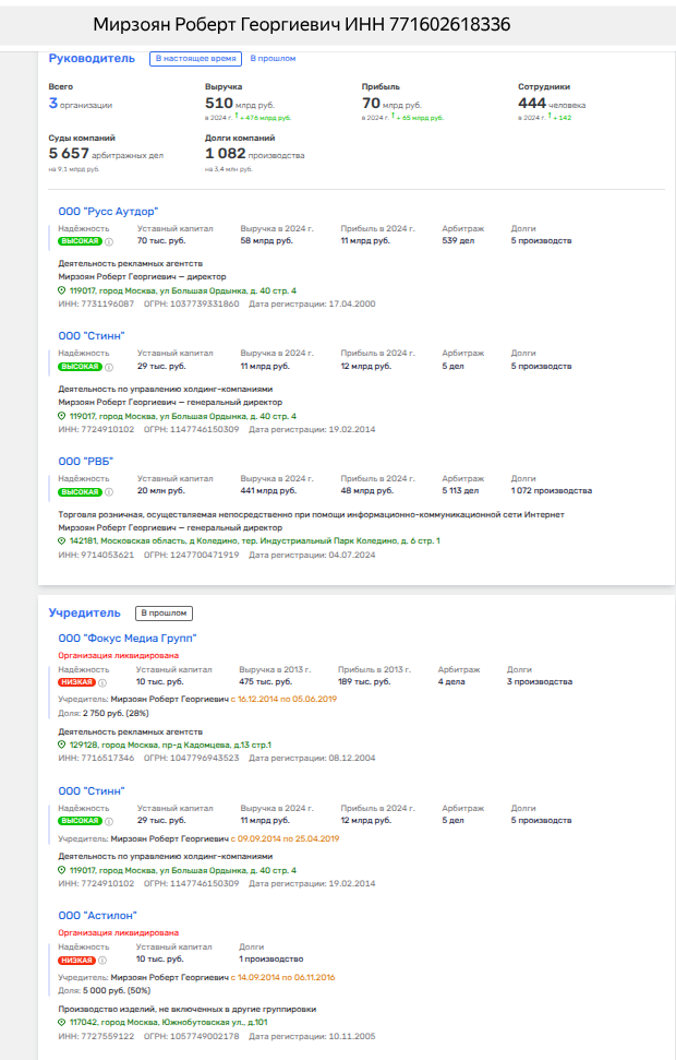 А еще, именно Грачёв рулит той частью дивизиона, что имеет отношение к «РВБ» и «Стинну» Мирзояна. Под крыло последней в 2025 году активно выводили фирмы, связанные с инвестированием в разные проекты. То есть фактически эта та часть кошелька сенатора, которую отделили от оскандалившегося рекламного бизнеса.