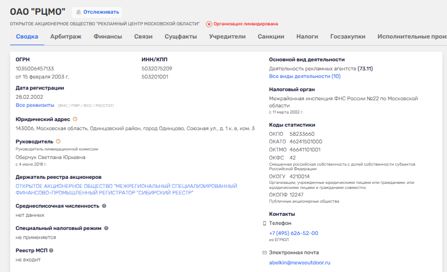 Итак, проходящая по делу Ионова как заноситель взяток Светлана Оберчук, судя по открытым данным, была руководителем некоего ОАО «Рекламный центр Московской области» (РЦМО), чей e-mail заканчивался на newsoutdoor.ru (а именно News Outdоor Russia до 2012 года и называлось Russ Outdоor), а номер телефона и вовсе был оформлен на Russ Outdoor.