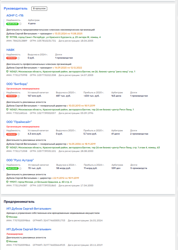 Если смотреть в Руспрофайл, то за Дубковым числились руководящие должности в рекламных «Праймсайт» и «Бигборд», причем одновременно с работой в ООО «Русс Аутдор», что намекает на связку этих структур между собой.