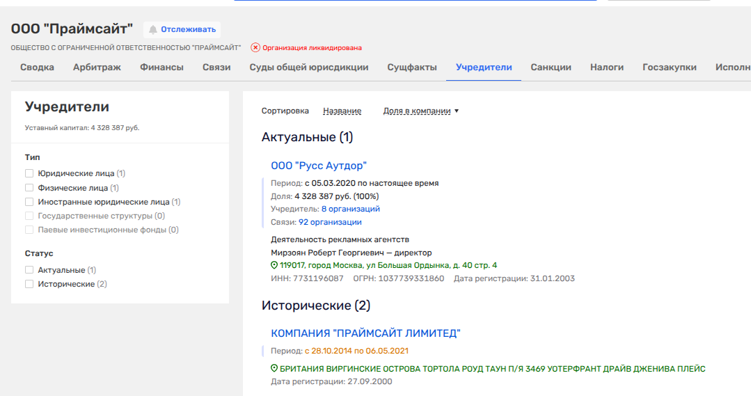 «Праймсайт» и «Бигборд» позднее были ликвидированы и влиты в ООО «Эдванс Холдинг», которое просуществовало до февраля 2024 года, его правопреемник - ООО «Русс Аутдор». Интересные совпадения, не так ли?