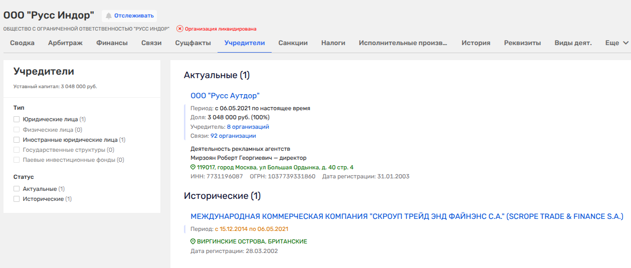 Интересно в них то, что везде успели наследить офшоры, через которые из рекламного бизнеса могли выводить капиталы. В частности, там мы видим «Праймсайт Лимитед» с Британских Виргинских островов и SCROPE TRADE & FINANCE S.A. оттуда же (через ныне ликвидированное ООО «Русс Индор»), которые были партнерами «Русс Аутдор» до 2021 года, то есть уже после прихода ставленника Керимова - Мирзояна в этот бизнес.
