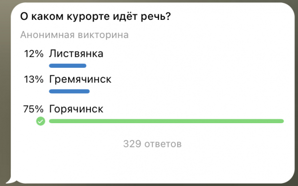 Телеграм-канал «Бурятия. Бабр. Дальше некуда» предложил читателю угадать, о каком курорте идёт речь. 75 % опрошенных выбрали правильный вариант – это бальнеологический курорт Горячинск.