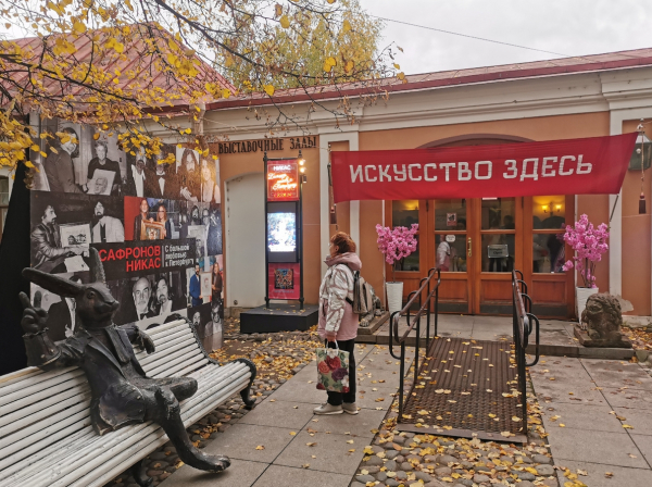 Заяц — местный, он всегда там сидит, остальное от Сафронова. Оформление входа сделано в рабочем стиле художника «эклектичный пиар». Лозунг должен вероятно напоминать о «колыбели революции», фотографии показывают уровень знаменитости художника, а розовенькие искусственные кусты просто торчат для нарядности. Выставка называлась «Большая любовь к Петербургу» и более положительного, приятного и оптимистичного названия трудно придумать, когда экспозиция развернута в Музее истории Санкт-Петербурга.