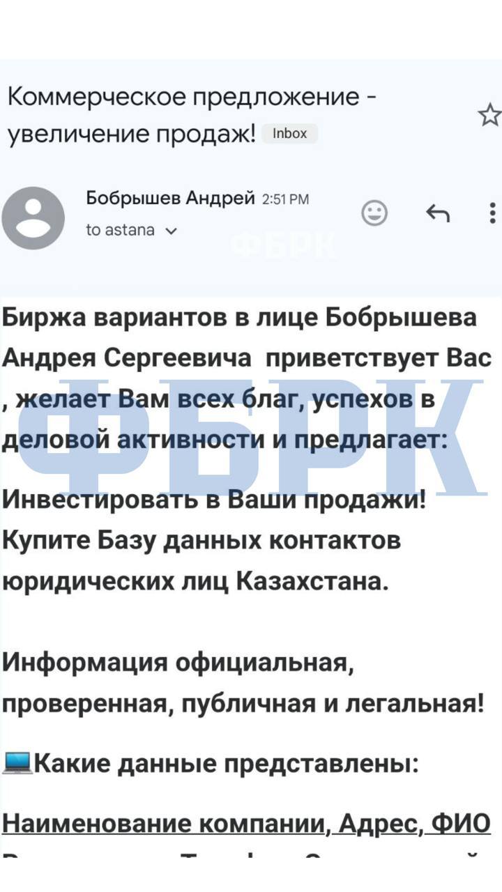 К слову, совсем недавно наша редакция получила рекламное сообщение с предложением приобрести базу данных контактов юридических лиц Казахстана.