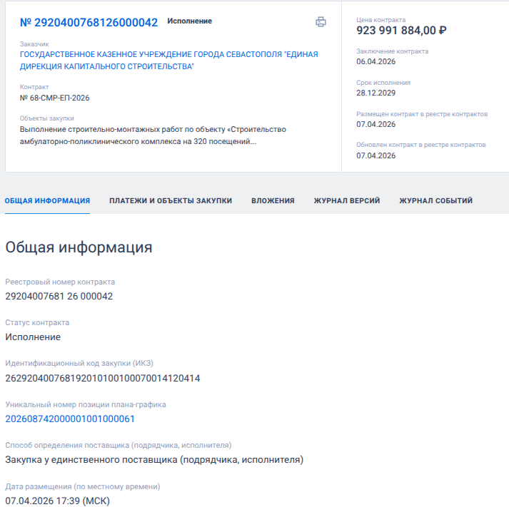 6 апреля 2026 года, опираясь на губернаторское распоряжение № 131-РГ от 24.03.2026, Единая дирекция капитального строительства Севастополя без лишних проволочек «подмахнула» контракт в рамках отработанной схемы с единственным поставщиком. Объект соглашения — амбулаторно-поликлинический комплекс на 320 посещений в смену, который возведут в районе 7-го км Балаклавского шоссе.