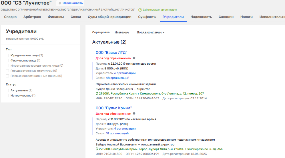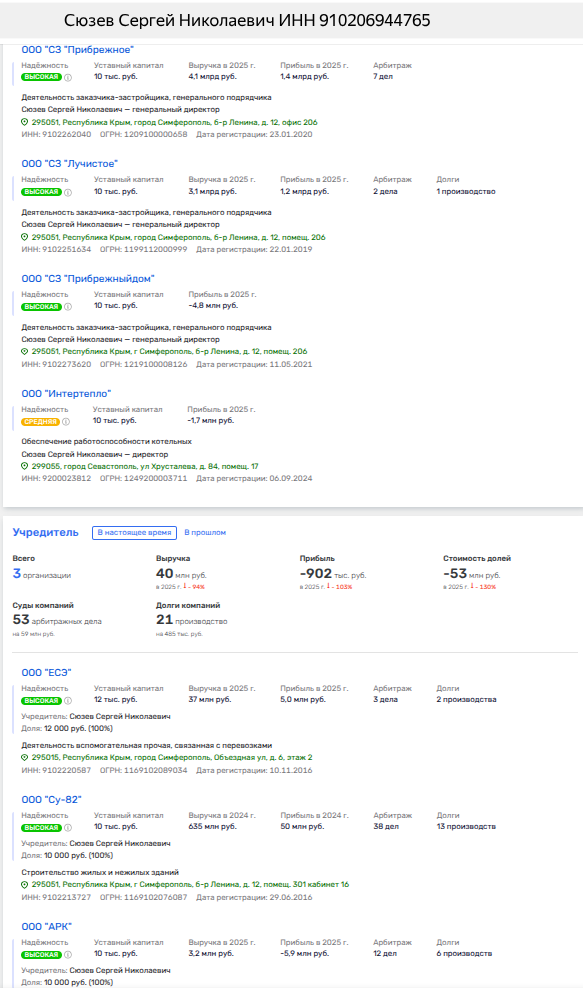 Уже 26 марта 2026 года под крыло наскоро созданного «ИС Управление Крым» передали сразу два юрлица — ООО СЗ «ТДК» и ООО СЗ «Айвазовский». Примечательно, что второе появилось на свет всего за месяц до этого, в конце февраля, и числится за тем самым «Интерстроем». Владельцы же первого субъекта уже были перечислены ранее, так что цепочка прослеживается без труда.