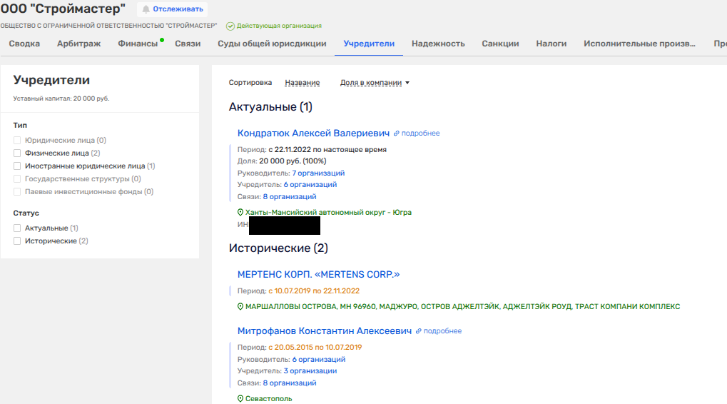 Помимо этого, Кондратюк - возможный держатель общакового офшора, некой MERTENS CORP. с Маршалловых островов, которое наследило в ООО «Строймастер». Помимо офшора и Кондратюка, там же мы видим и некоего Константина Митрофанова из Севастополя, который по ряду компаний тесно связан как раз с бывшим вице-премьером Крыма Евгением Кабановым и семейством спикера Госсовета Крыма Владимира Константинова, чьим бизнесом также частично управляют фирмы Кабанова.