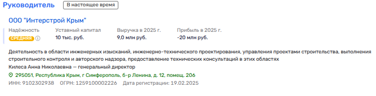 Нельзя обойти вниманием и ещё один актив Кабанова, учреждённый в 2025 году, — ООО «ИНТЕРСТРОЙ КРЫМ». Во главе его стоит некая Анна Николаевна Килеса, чьё полное имя на удивление совпадает с должностью бывшего заместителя министра строительства и архитектуры Крыма, занимавшей этот пост с мая по июль 2025-го.